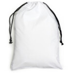 This bag is simple, humble and useful. It can be easily folded and tucked away and used for a multitude of purposes. It is made with 140gsm calico cotton and features drawstring closing.